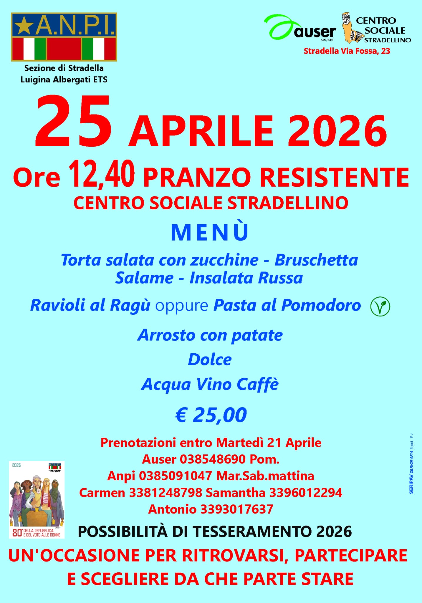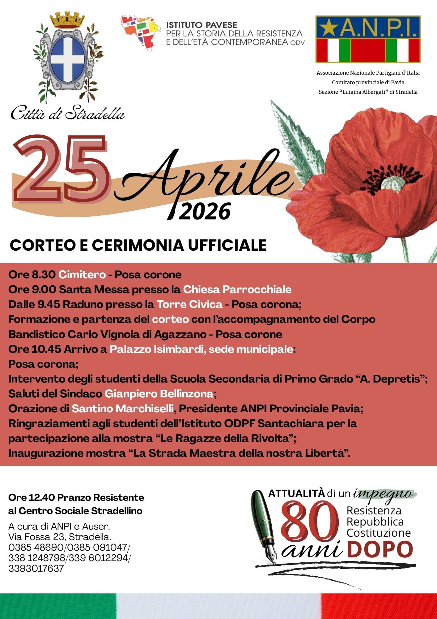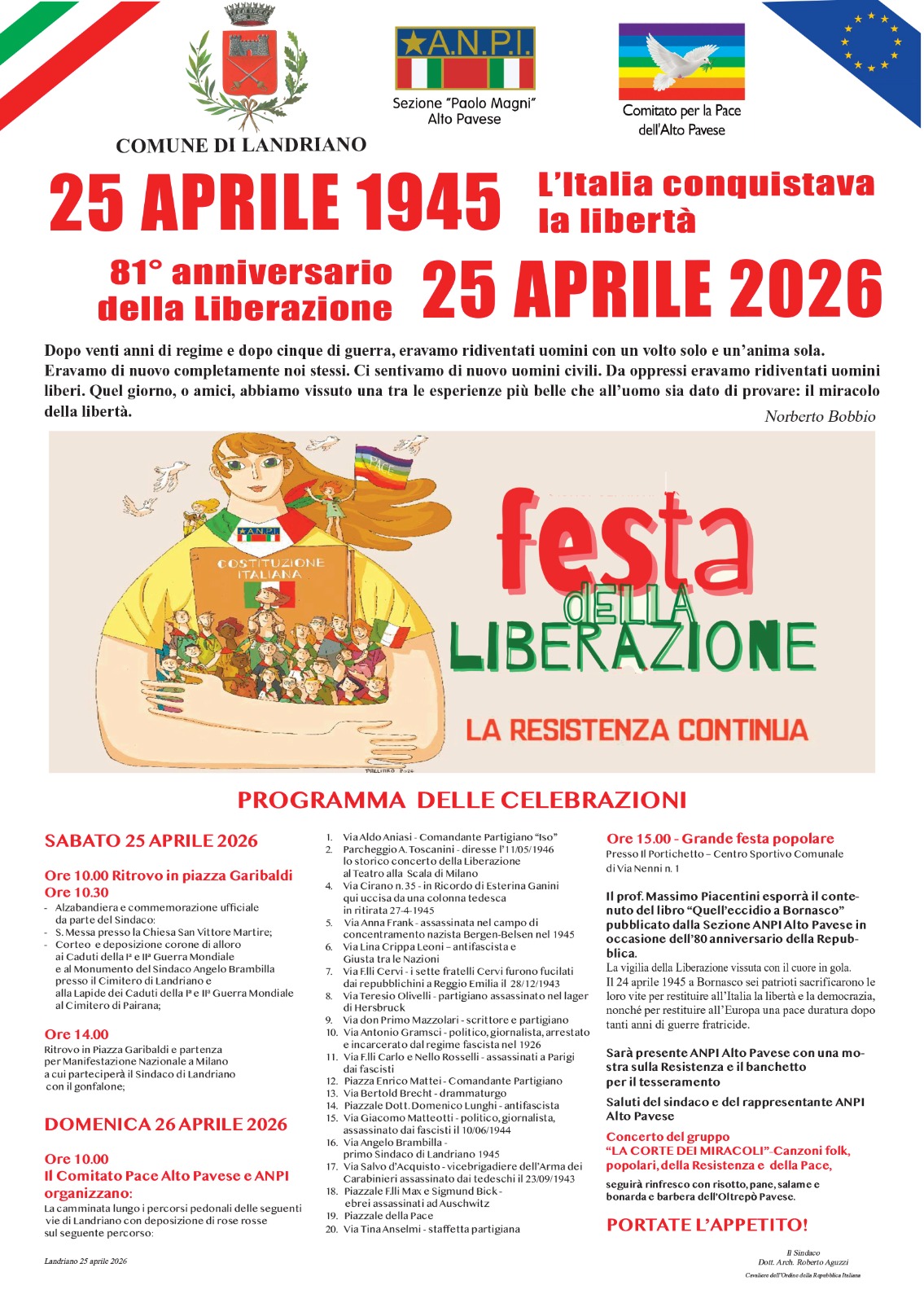 25 aprile 2026 Pubblicato il 22 Aprile 2026 da anpipavia Festa della Liberazione – Eventi 25 apr Anpi Corvino SQDownload 25 apr belgioiosoDownload 25 apr Bressana BDownload 25 aprile 2026 Bastida pancaranaDownload 25 Aprile PAVIA 2026Download 25 aprile-VOGHERADownload aprile 2026 BroniDownload Anpi Nazionale VOLANTINO 25 APRILE A4Download